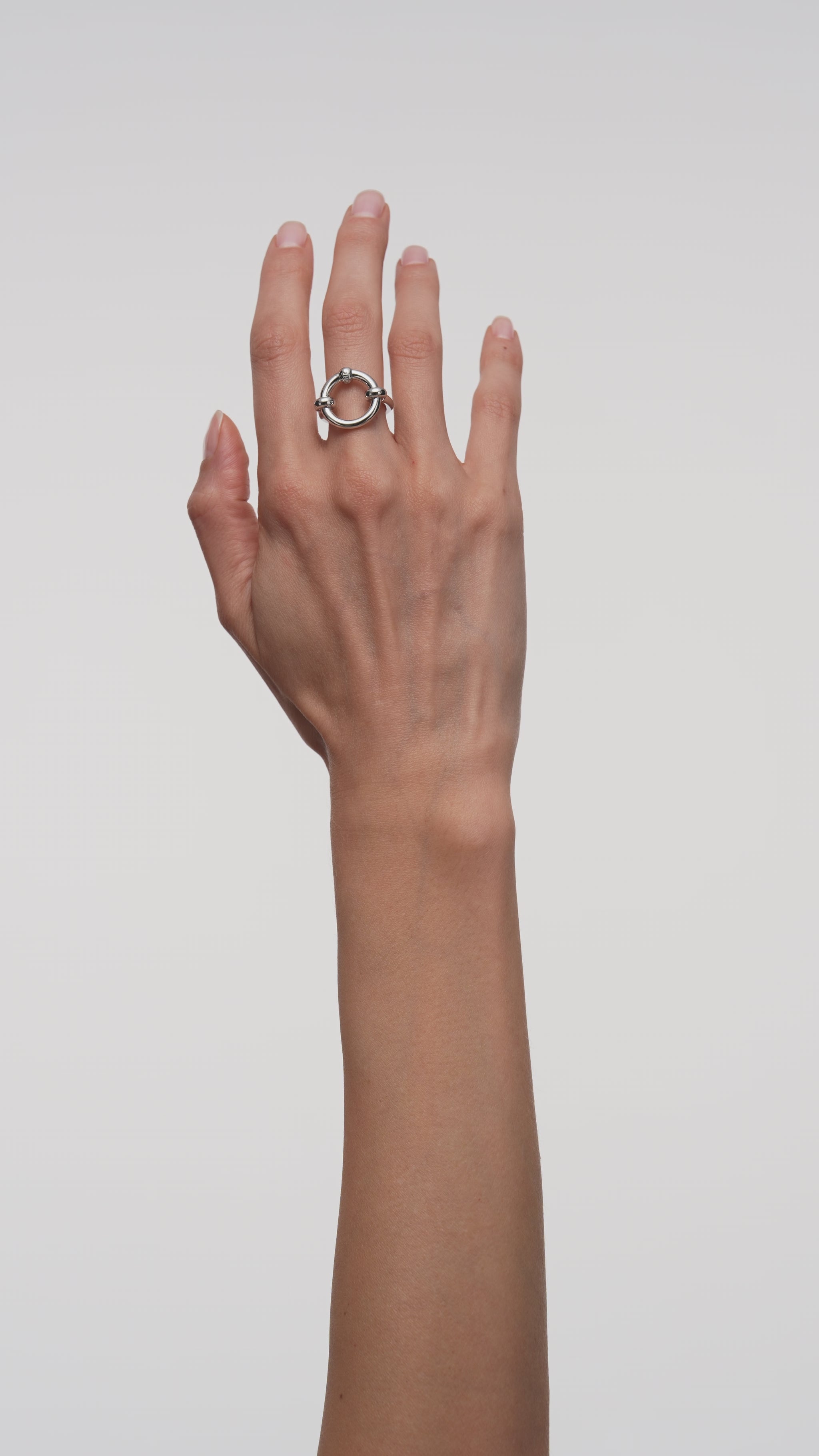 Лаконічна та невимушено стильна, каблучка Harmony Silver з родієвим покриттям має мінімалістичний, але виразний дизайн. Акцентне пласке коло в центрі та сучасна кулька, натхненна пірсингом, додають легкого зухвалого відтінку, а загальний образ випромінює стриману елегантність.